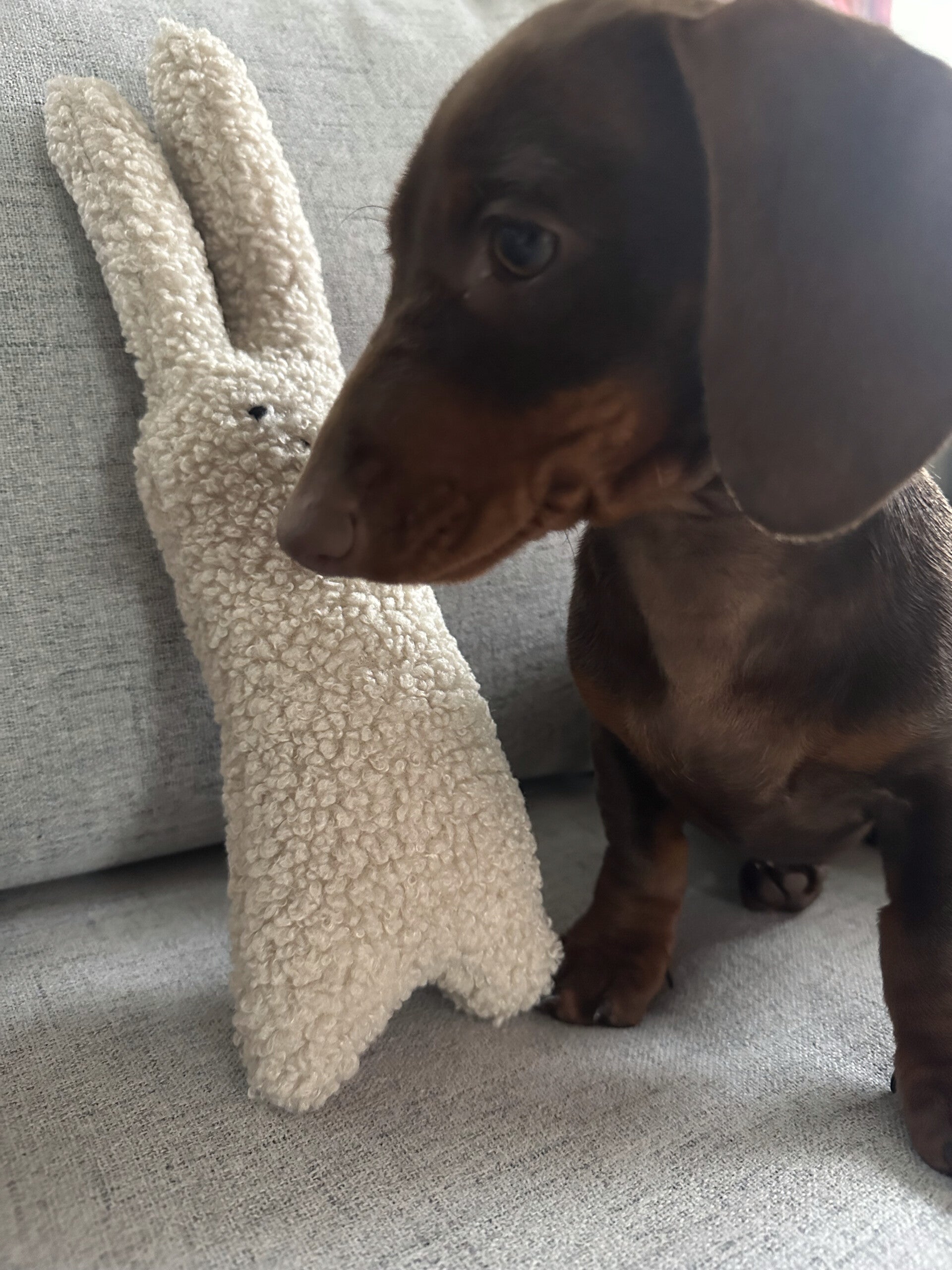 Er ist schief, er ist charmant – und genau deshalb lieben wir ihn! Unser Hey Hasi ist kein 08/15-Hase, sondern ein echtes Unikat mit Ecken, Kanten und jeder Menge Herz. Mit ca. 33 cm Höhe und 9 cm Breite ist er der perfekte Begleiter zum Kuscheln, Spielen und Liebhaben – für Groß und Klein.